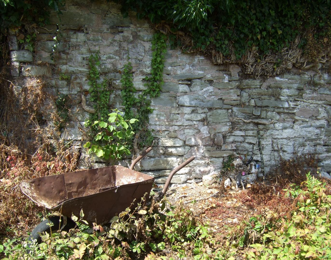And then we pushed it back across Ludlow, from Ludlow Library, along Tower Street, across the Bull Ring, up King Street, and back to the derelict garden where the wheelbarrow has rested for decades. In the hot sun, kneeling on weeds turned crackly with drought, Kate slowly placed the objects we’d brought at the foot of a crumbling old wall.