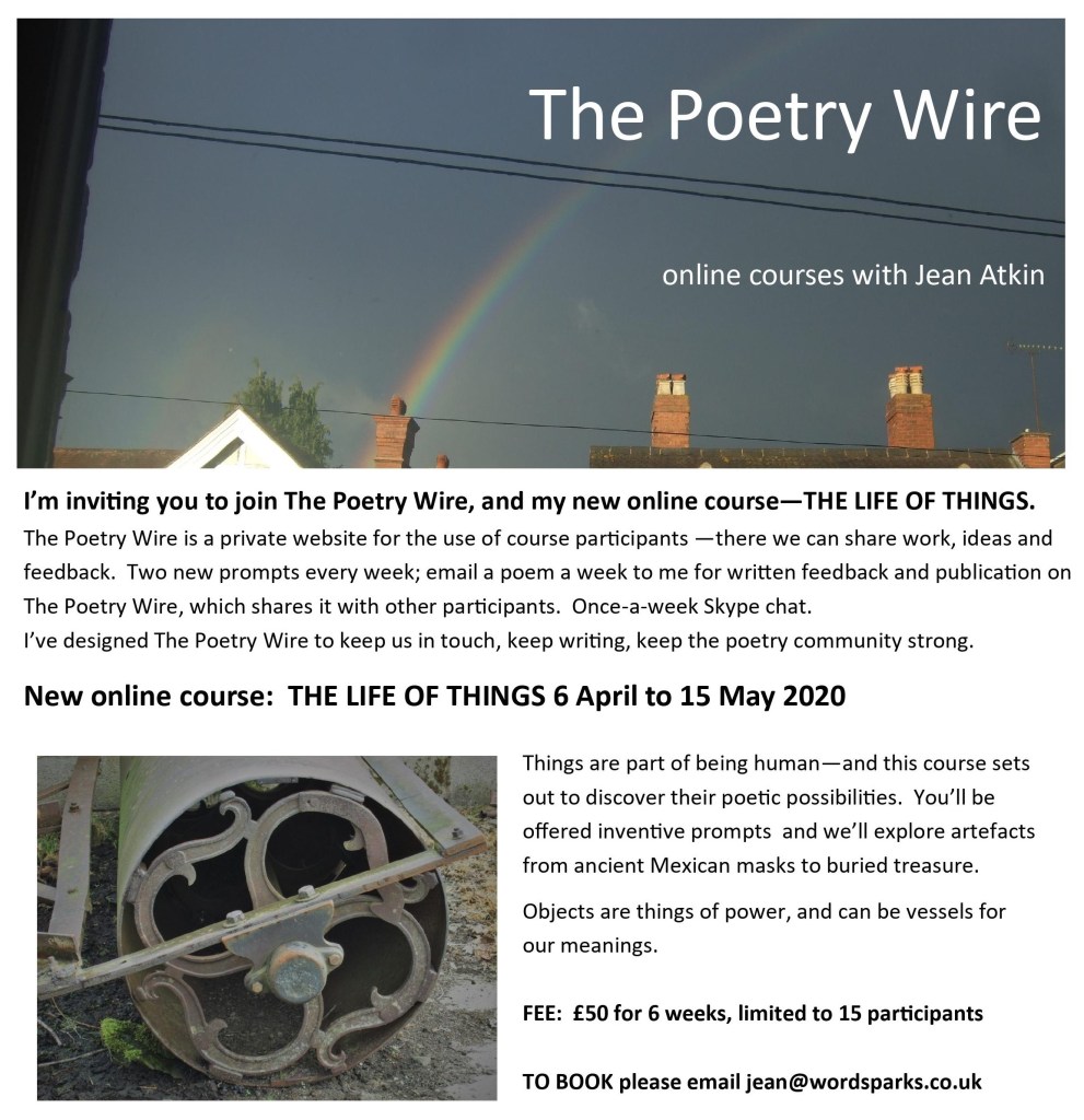 The Poetry Wire is a private website for participants on my new online courses – the first of which starts on 6 April and is called THE LIFE OF THINGS. This first course is now completely sold out, but there will be subsequent courses, so watch this space and do drop me a line if you’re interested.