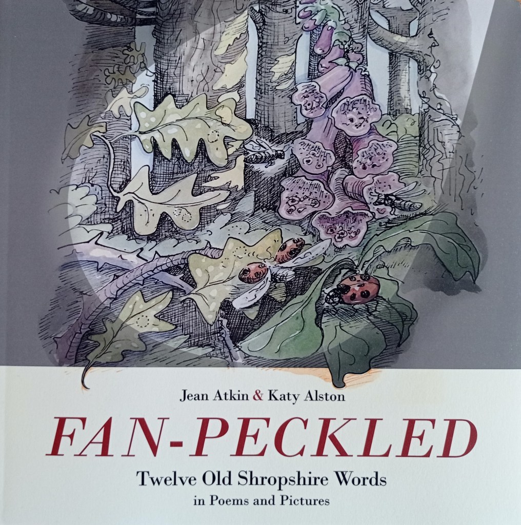 Old Shropshire words are the inspiration for my twelve poems which celebrate the county, its language and its strong sense of place. Each of the words and phrases featured were discovered in the marvellously obscure ‘Shropshire Word-Book’, published in Shrewsbury in 1879. ‘Fan-peckled’ just means ‘freckled’ and was collected in Wem and Whitchurch. Each word or phrase in the Word-Book is translated into Standard English, and given a provenance to show where it was collected, long ago in the 1870s. So from Bishop’s Castle comes ‘shalligonaked’, from Wellington ‘noon-spell’ and from Much Wenlock, ‘barley-child’.